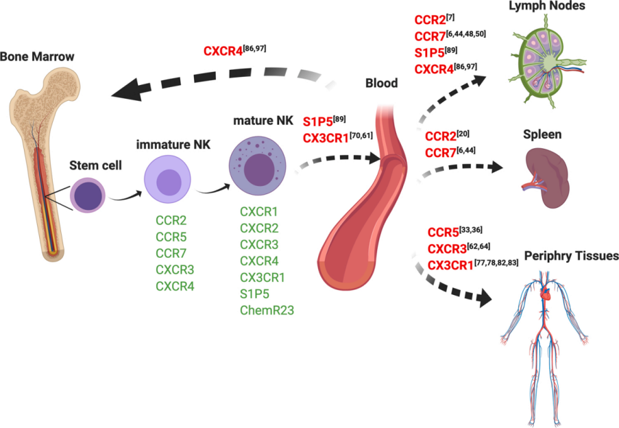 以自然杀伤(NK)细胞为基础的细胞治疗已经成为治疗多种恶性肿瘤的强大武器。然而,治疗性NK细胞向实体肿瘤的浸润不足仍然是其临床应用的一个巨大挑战。而趋化因子网络在淋巴细胞的迁移中发挥着重要作用,已经被认为是驱动NK细胞瘤内浸润的关键。
