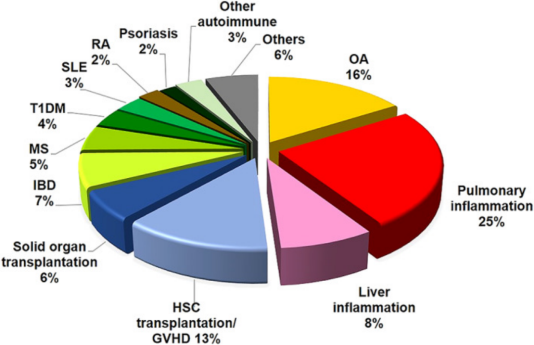 众多已完成的临床试验证明了MSC输注对治疗多种疾病的疗效,例如移植物抗宿主病(GvHD)、多发性硬化症(MS)、克罗恩病(CD)、肌萎缩侧索硬化症(ALS)、心肌梗死(MI)、糖尿病(DM)和急性呼吸窘迫综合征(ARDS)等[6]。在这些临床试验中,MSC治疗“神经”疾病(17%)和“关节”疾病(15%)是注册适应症中最常见的。心血管疾病(8.8%)和GvHD(8.3%)与该疾病密切相关,III期临床试验的比例更高。有84%的MSC临床试验明确指定了给药途径。